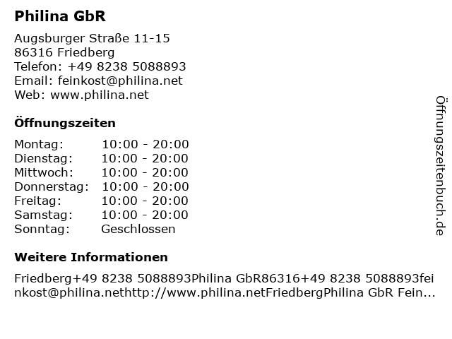 | Öffnungszeiten Philina GbR in Friedberg anzeigen | |