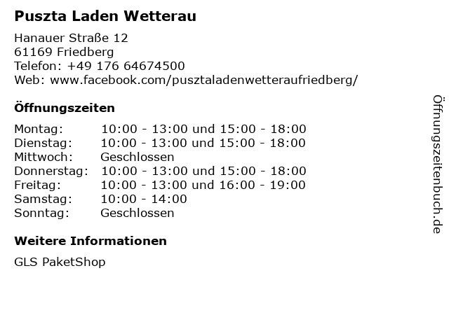 | Öffnungszeiten Puszta Laden Wetterau in Friedberg anzeigen | |