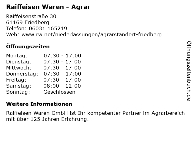 | Öffnungszeiten Raiffeisen Waren - Agrar in Friedberg anzeigen | |