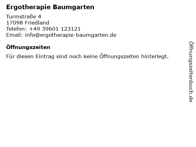 | Öffnungszeiten Ergotherapie Baumgarten in Friedland anzeigen | |