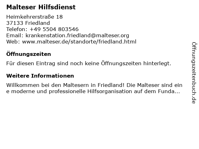| Öffnungszeiten Malteser Hilfsdienst in Friedland anzeigen | |