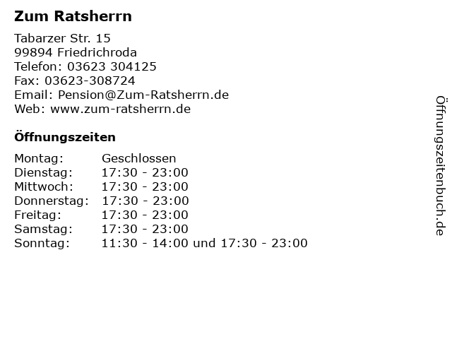 | Öffnungszeiten Zum Ratsherrn in Friedrichroda anzeigen | |