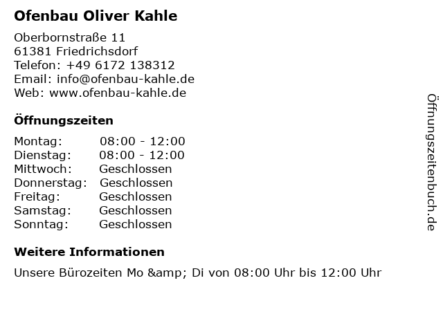 | Öffnungszeiten Ofenbau Oliver Kahle in Friedrichsdorf anzeigen | |