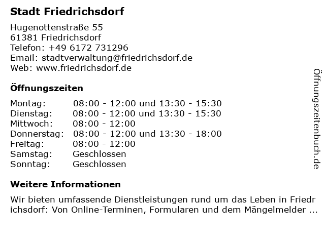 | Öffnungszeiten Stadt Friedrichsdorf in Friedrichsdorf anzeigen | |