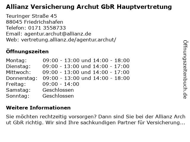 1 Allianz Versicherung Archut GbR Hauptvertretung (Entfernung: 2,09 km) Allmandstraße 9, 88045 Friedrichshafen 2 Allianz Versicherung Johannes Rueß Hauptvertretung (Entfernung: 9,76 km) Bahnhofstraße 9, 88085 Langenargen 5 Allianz Versicherung Marc Rundel Hauptvertretung (Entfernung: 14,71 km) Tettnanger Straße 361/1, 88214 Ravensburg 6 Allianz Versicherung Frank Rettinger Hauptvertretung (Entfernung: 14,71 km) Tettnanger Straße 1, 88214 Ravensburg |