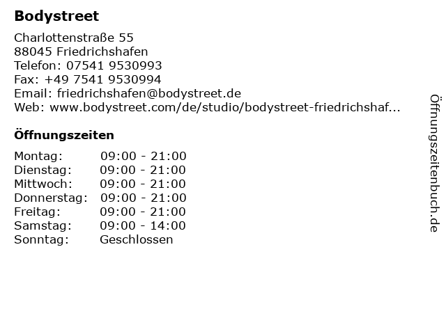 | Öffnungszeiten Bodystreet in Friedrichshafen anzeigen | |