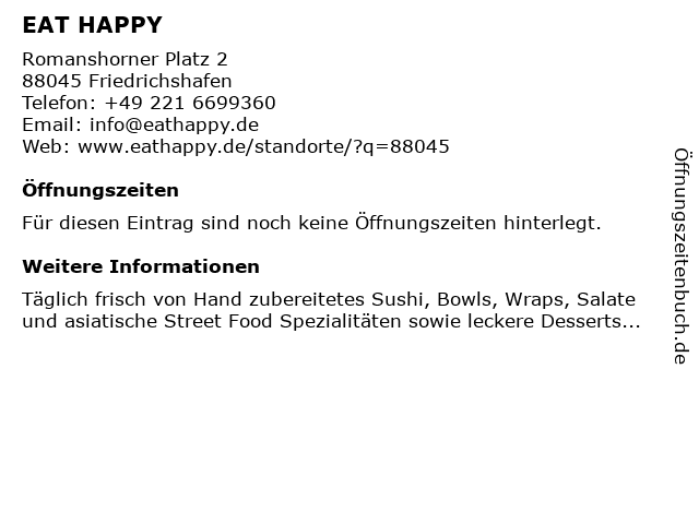 | Öffnungszeiten EAT HAPPY in Friedrichshafen anzeigen | |