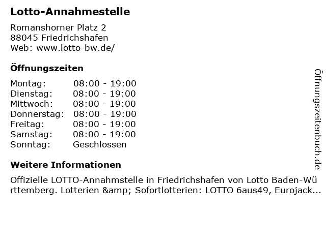 | Öffnungszeiten Lotto-Annahmestelle in Friedrichshafen anzeigen | |