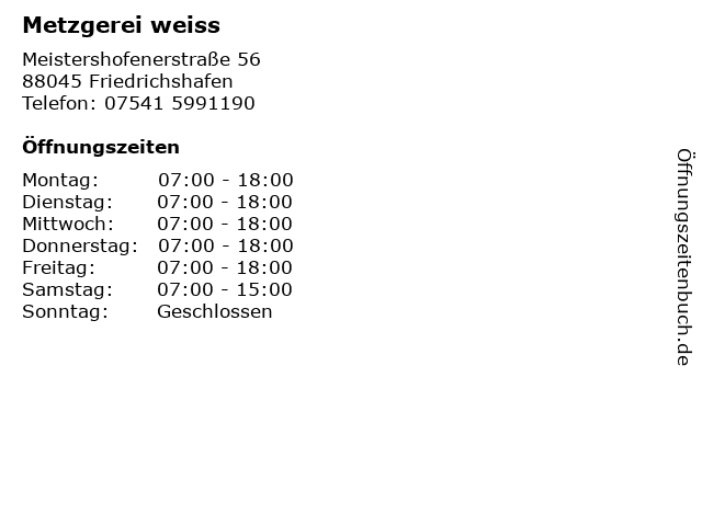 | Öffnungszeiten Metzgerei weiss in Friedrichshafen anzeigen | |
