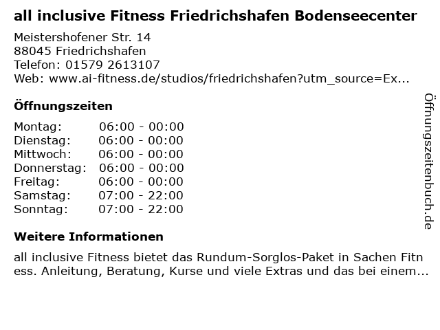 4 Best Western Hotel Goldenes Rad | Sauna & Fitness (Entfernung: 1,68 km) Karlstr. 43, 88045 Friedrichshafen 5 Claudines Fitness & Squash Treff (Okt. - Juni) (Entfernung: 2,23 km) Lindauerstr. 59, 88046 Friedrichshafen 6 all inclusive Fitness Friedrichshafen Flughafen (Entfernung: 2,94 km) Am Flugplatz 76/3, 88046 Friedrichshafen |