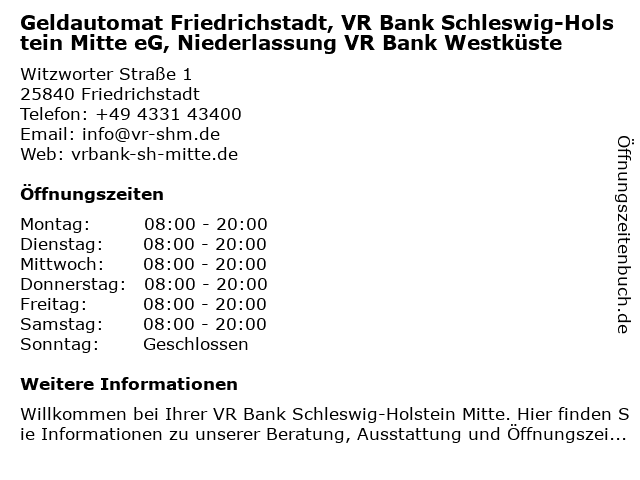 Branchen & Suchbegriffe zu Geldautomat Friedrichstadt, VR Bank Schleswig-Holstein Mitte eG, Niederlassung VR Bank Westküste:bank, eg, geldautomat, holstein, mitte, niederlassung, vr, westküste |