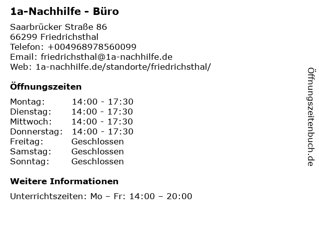 | Öffnungszeiten 1a-Nachhilfe - Büro in Friedrichsthal anzeigen | |