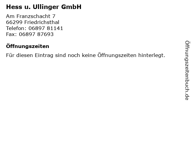 | Öffnungszeiten Hess u. Ullinger GmbH in Friedrichsthal anzeigen | |