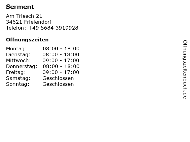 | Öffnungszeiten Serment in Frielendorf anzeigen | |