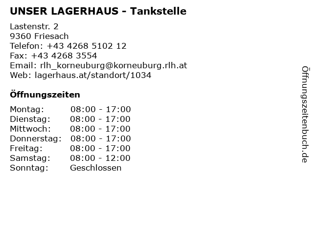2 UNSER LAGERHAUS Warenhandelsgesellschaft m.b.H. - Tankstelle (Entfernung: 0,00 km) Lastenstr. 2, 9360 Friesach 3 Unser Lagerhaus Warenhandelsgesellschaft m.b.H. - Agrar und Bau und Garten (Entfernung: 0,00 km) Lastenstr. 2, 9360 Friesach 5 Unser Lagerhaus Warenhandelsgesellschaft m.b.H. - Bau & Garten (Entfernung: 10,65 km) Bahnstraße 3, 9330 Treibach 6 Unser Lagerhaus Warenhandelsgesellschaft m.b.H. - Landmaschinen-Handel (Entfernung: 10,70 km) Funderstr. 18, 9330 Treibach |