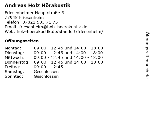 | Öffnungszeiten Andreas Holz Hörakustik in Friesenheim anzeigen | |