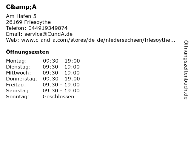 | Öffnungszeiten C&A in Friesoythe anzeigen | |