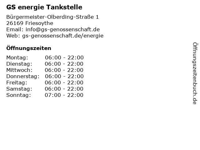 | Öffnungszeiten GS energie Tankstelle in Friesoythe anzeigen | |