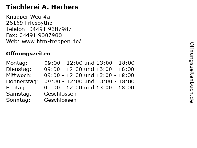 | Öffnungszeiten Tischlerei A. Herbers in Friesoythe anzeigen | |