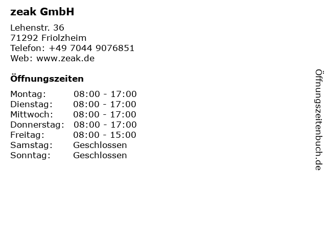 | Öffnungszeiten zeak GmbH in Friolzheim anzeigen | |