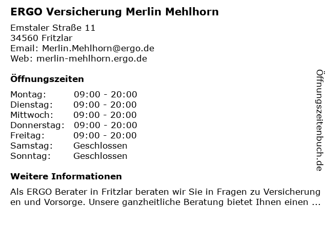 | Öffnungszeiten ERGO Versicherung Merlin Mehlhorn in Fritzlar anzeigen | |