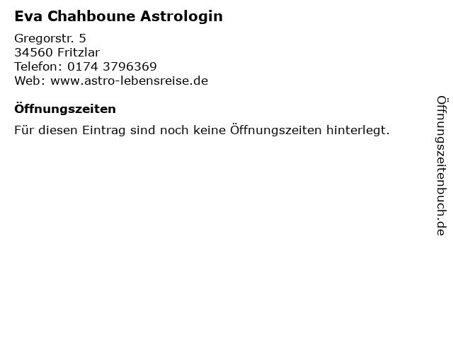 | Öffnungszeiten Eva Chahboune Astrologin in Fritzlar anzeigen | |