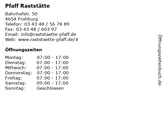 | Öffnungszeiten Pfaff Raststätte in Frohburg anzeigen | |