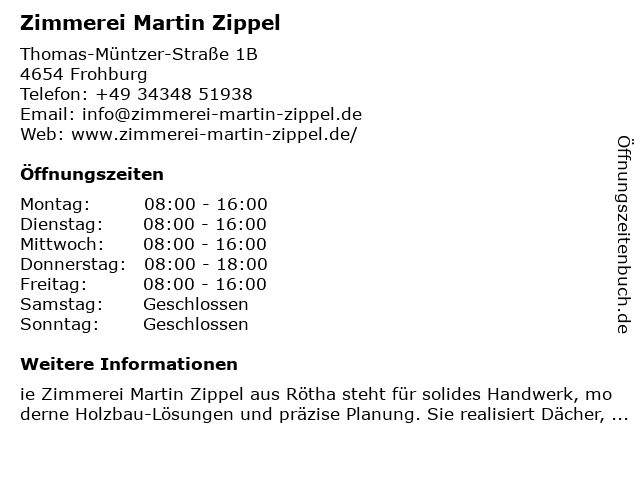 | Öffnungszeiten Zimmerei Martin Zippel in Frohburg anzeigen | |