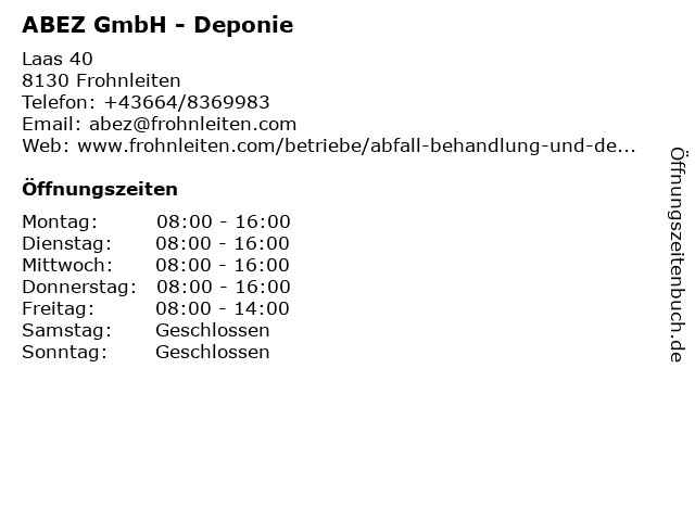 | Öffnungszeiten ABEZ GmbH - Deponie in Frohnleiten anzeigen | |