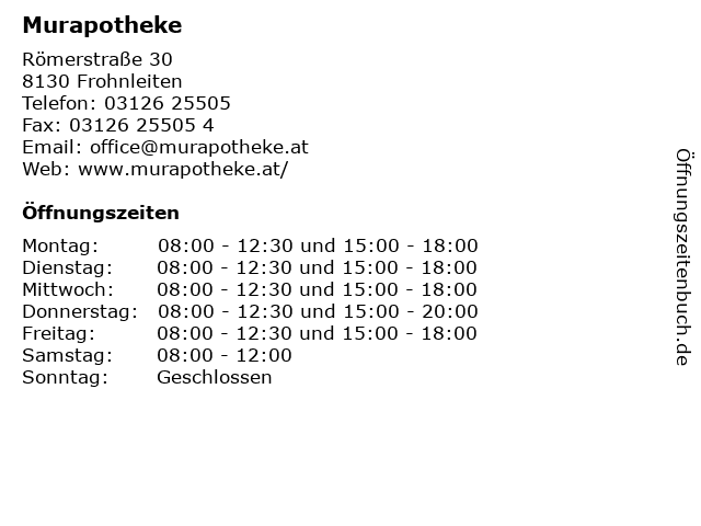 | Öffnungszeiten Murapotheke in Frohnleiten anzeigen | |