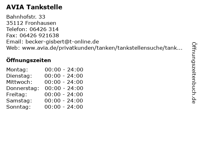 | Öffnungszeiten AVIA Tankstelle in Fronhausen anzeigen | |