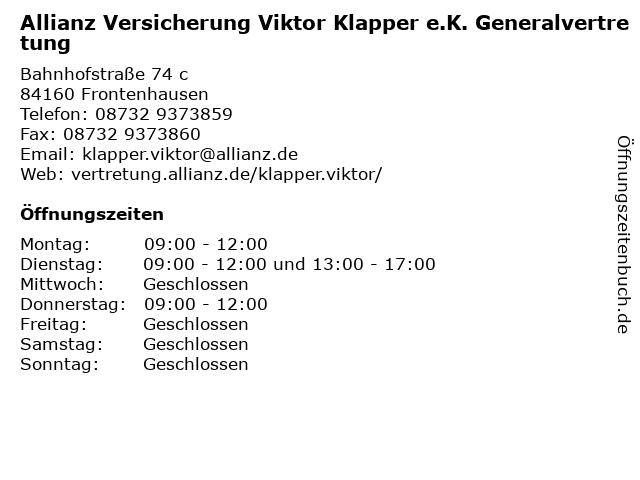 1 Allianz Versicherung Viktor Klapper u. Co.OHG Generalvertretung (Entfernung: 0,01 km) Bahnhofstraße 74 c, 84160 Frontenhausen 2 Allianz Versicherung Raab und Grassinger OHG Generalvertretung (Entfernung: 2,34 km) Klosterstraße 4, 84163 Marklkofen 4 Allianz Versicherung Rauscher Generalvertretung (Entfernung: 10,09 km) Loichinger Straße 3, 84130 Dingolfing 5 R+V Versicherung Gottfrieding - Generalvertretung Christian Taitsch (Entfernung: 10,94 km) Brückenstraße 24 1/4, 84177 Gottfrieding 6 Allianz Versicherung Wasner und Hartmann OHG Generalvertretung (Entfernung: 12,45 km) Bahnhofstraße 14, 84140 Gangkofen |