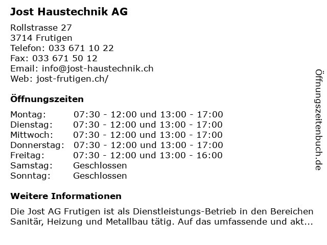 | Öffnungszeiten Jost Haustechnik AG in Frutigen anzeigen | |