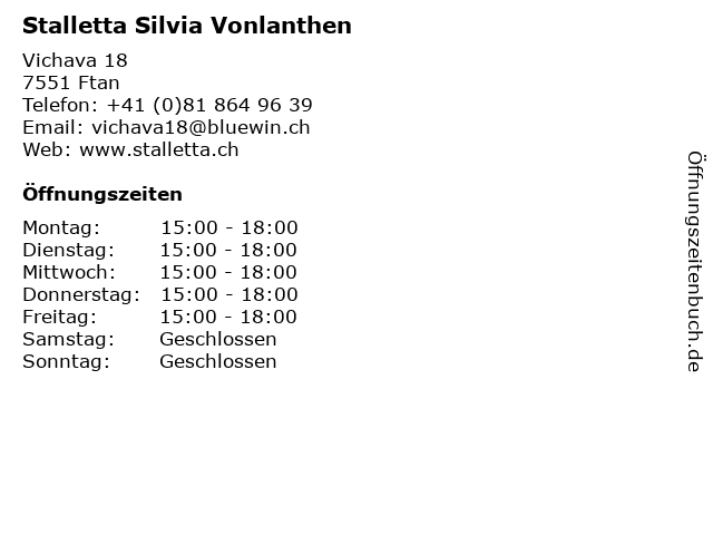 | Öffnungszeiten Stalletta Silvia Vonlanthen in Ftan anzeigen | |