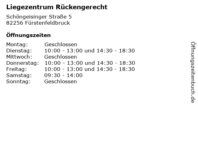 | Öffnungszeiten Liegezentrum Rückengerecht in Fürstenfeldbruck anzeigen | |
