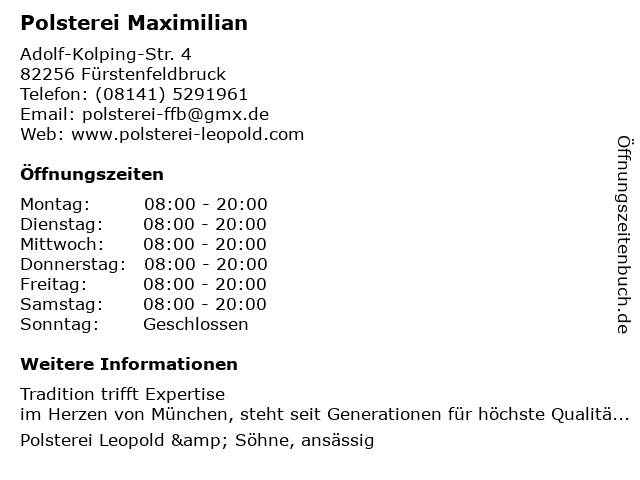 4 Teppichwäscherei und Polsterei Graf Inh. A. Graf (Entfernung: 11,22 km) Stegmairstr. 6, 82110 Germering 6 Anton Suppmair Raumausstattung und Polsterei (Entfernung: 14,28 km) St.-Helena-Str. 10, 85254 Sulzemoos  |
