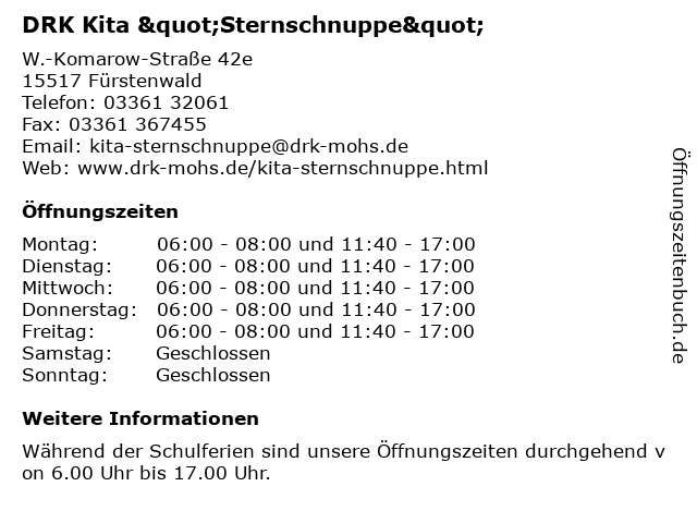 | Öffnungszeiten DRK Kita "Sternschnuppe" in Fürstenwald anzeigen | |
