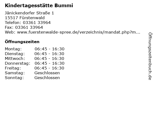 | Öffnungszeiten Kindertagesstätte Bummi in Fürstenwald anzeigen | |