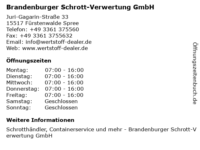 1 AIR LIQUIDE Deutschland GmbH - Brandenburger Schrottverwertung GmbH (Entfernung: 0,16 km) Juri-Gagarin-Straße 33, 15517 Fürstenwalde 5 Recycling von Schrott, Reststoffen & Edelmetallen, Michael Gundlach (Entfernung: 14,55 km) Frankfurter Str. 63, 15518 Briesen 6 |