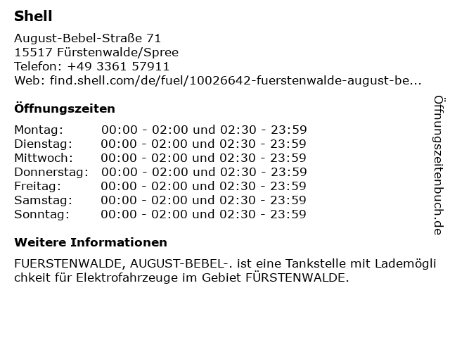 | Öffnungszeiten Shell in Fürstenwalde/Spree anzeigen | |