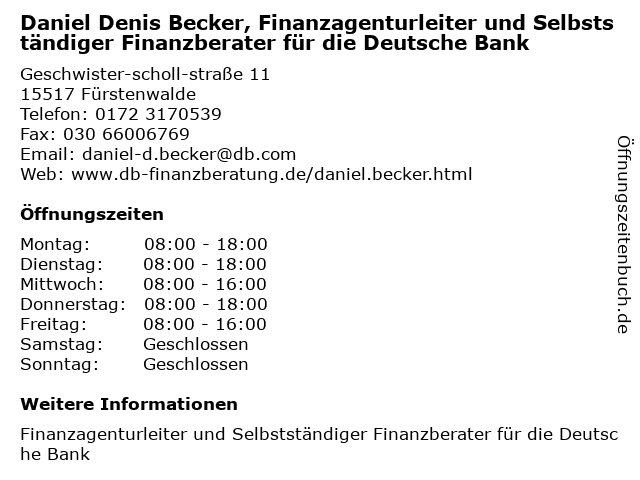 Branchen & Suchbegriffe zu Daniel Denis Becker, Finanzagenturleiter und Selbstständiger Finanzberater für die Deutsche Bank:bank, becker, daniel, denis, deutsche, finanzagenturleiter, finanzberater, selbstständiger |