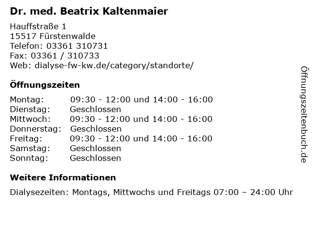 4 Dialysepraxis Fürstenwalde - Nephrologische Sprechstunde (Entfernung: 0,00 km) Hauffstrasse 1, 15517 Fürstenwalde 6 Heike Himmer Fachärztin für Innere Medizin und Nephrologie (Entfernung: 22,28 km) Hermannstr. 40, 15562 Rüdersdorf |