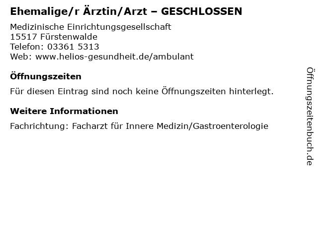 1 Ehemalige/r Ärztin/Arzt – GESCHLOSSEN (Entfernung: 0,02 km) Medizinische Einrichtungsgesellschaft , 15517 Fürstenwalde 2 Ehemalige/r Ärztin/Arzt – GESCHLOSSEN (Entfernung: 10,15 km) Helios Mvz Am Helios Klinikum Bad Saarow , 15526 Bad Saarow 3 Ehemalige/r Ärztin/Arzt – GESCHLOSSEN (Entfernung: 10,16 km) Helios Mvz Am Helios Klinikum Bad Saarow , 15526 Bad Saarow 4 Dr. med. Svend Barthel - Arzt für Allgemeinmedizin (Entfernung: 0,64 km) Johann-Sebastian-Bach-Straße 25, 15517 Fürstenwalde 6 |