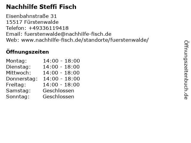 | Öffnungszeiten Nachhilfe Steffi Fisch in Fürstenwalde anzeigen | |