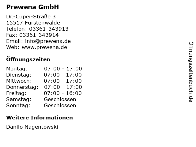 | Öffnungszeiten Prewena GmbH in Fürstenwalde anzeigen | |