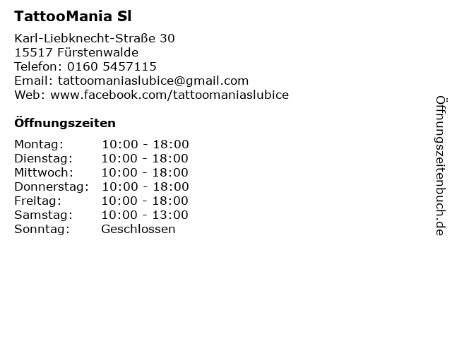 | Öffnungszeiten TattooMania Sl in Fürstenwalde anzeigen | |