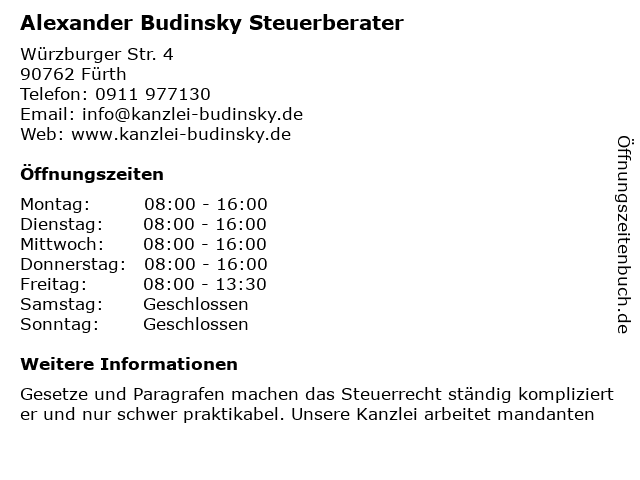 1 Steuerberater Budinsky A. Diplom-Betriebswirt (FH) (Entfernung: 0,00 km) Würzburger Str. 4, 90762 Fürth 6 |
