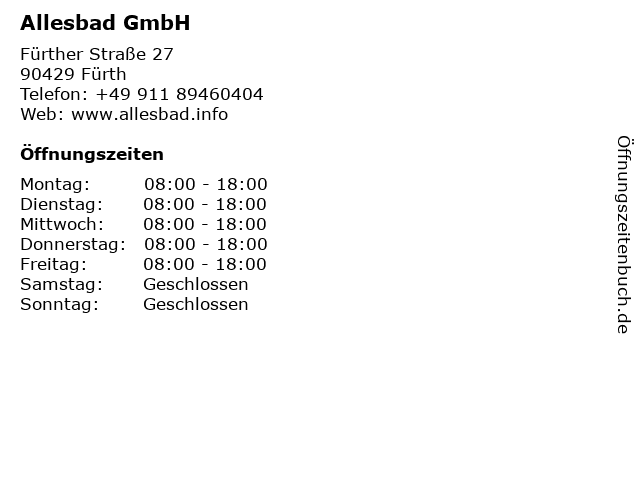 | Öffnungszeiten Allesbad GmbH in Fürth anzeigen | |