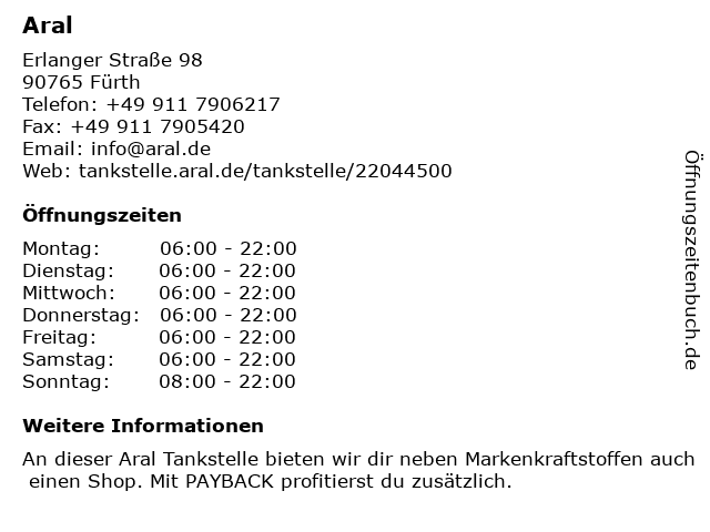 | Öffnungszeiten Aral in Fürth anzeigen | |
