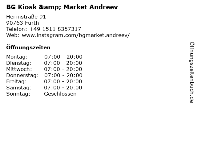| Öffnungszeiten BG Kiosk & Market Andreev in Fürth anzeigen | |
